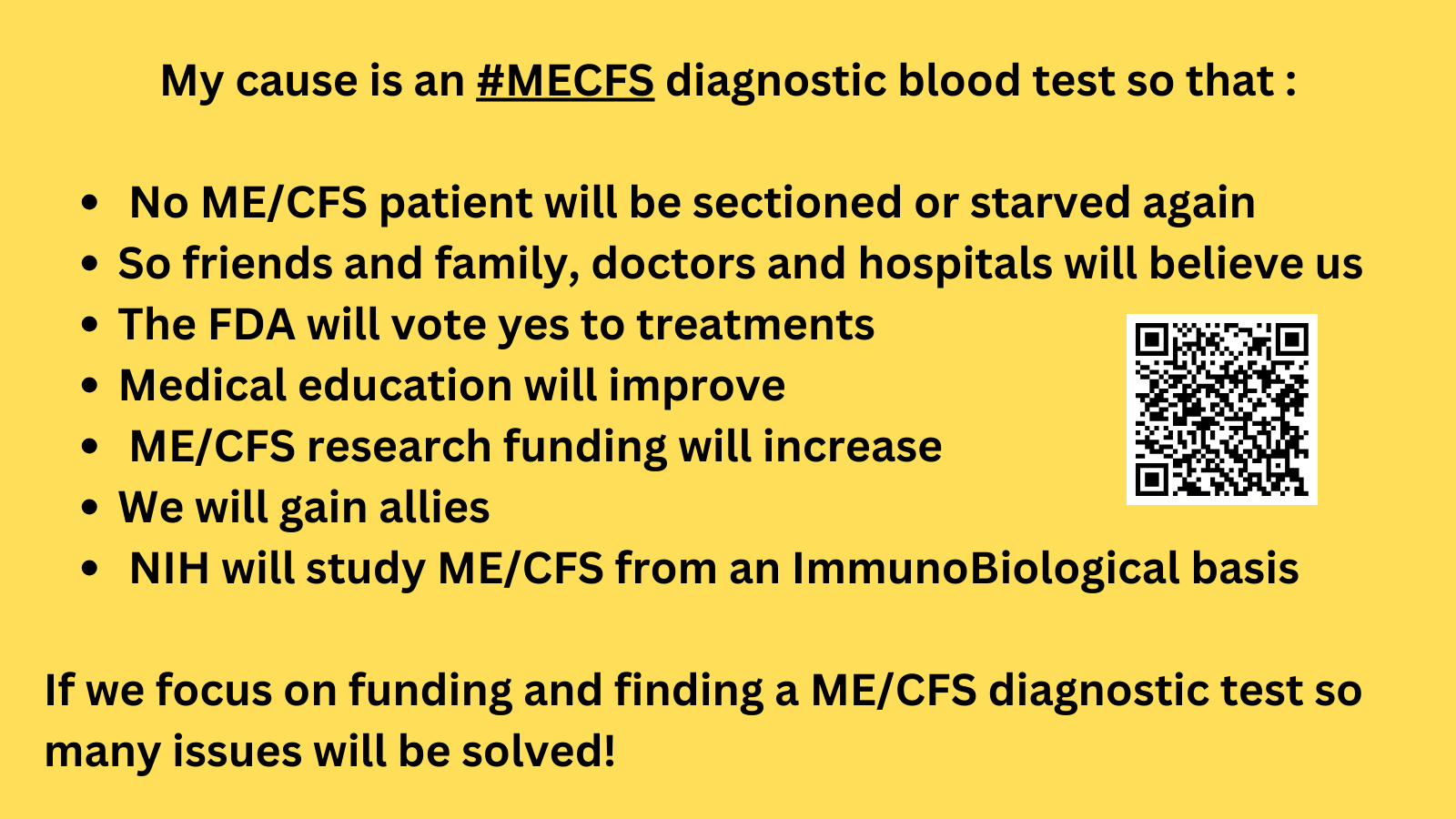 I am a Severe ME/CFS patient. I am bedridden, and I cannot speak. ME/CFS biomarkers are important to me because I would like to see a validated biomarker become a ME/CFS diagnostic blood test that changes the world for ME/CFS patients worldwide.